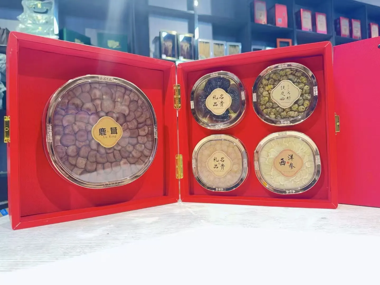 正品东北特产喜服团圆双层四宝礼盒皮质款,高端大气寓意也好,今年过节就买它,倍有面子!内含,鹿茸30克。西洋参片15克。红参片20克,铁皮石斛50克,灵芝15克