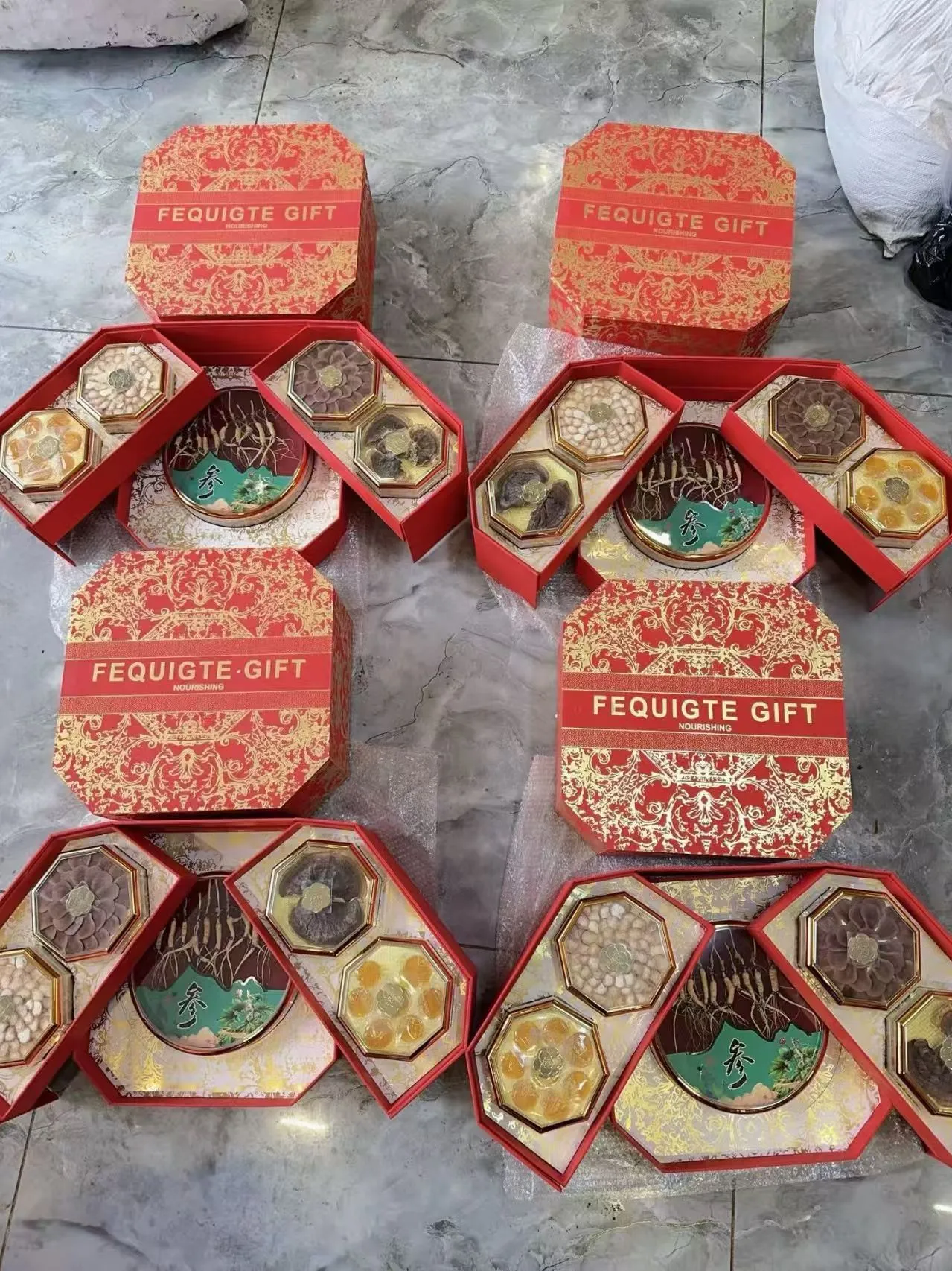 内含:林下参、鹿茸、人参蜜片、灵芝,采用双层设计,高端大气,送礼必备。