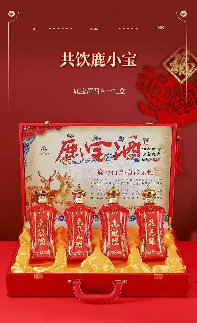 鹿宝酒礼盒送礼大方,一盒里面是四瓶酒,一瓶是500ml 四合一礼盒,鹿鞭酒 鹿茸血酒 鹿筋酒 鹿尾酒。礼盒内置二维码官方扫码价是2688,特别适合过节送礼,大气上档次。