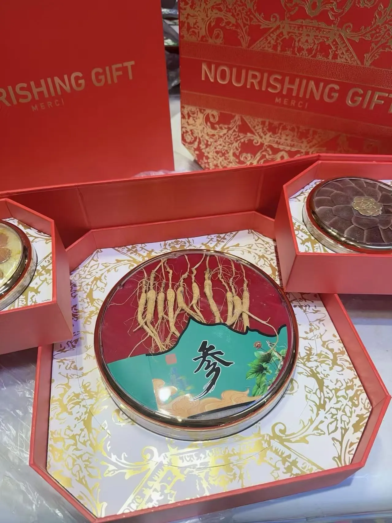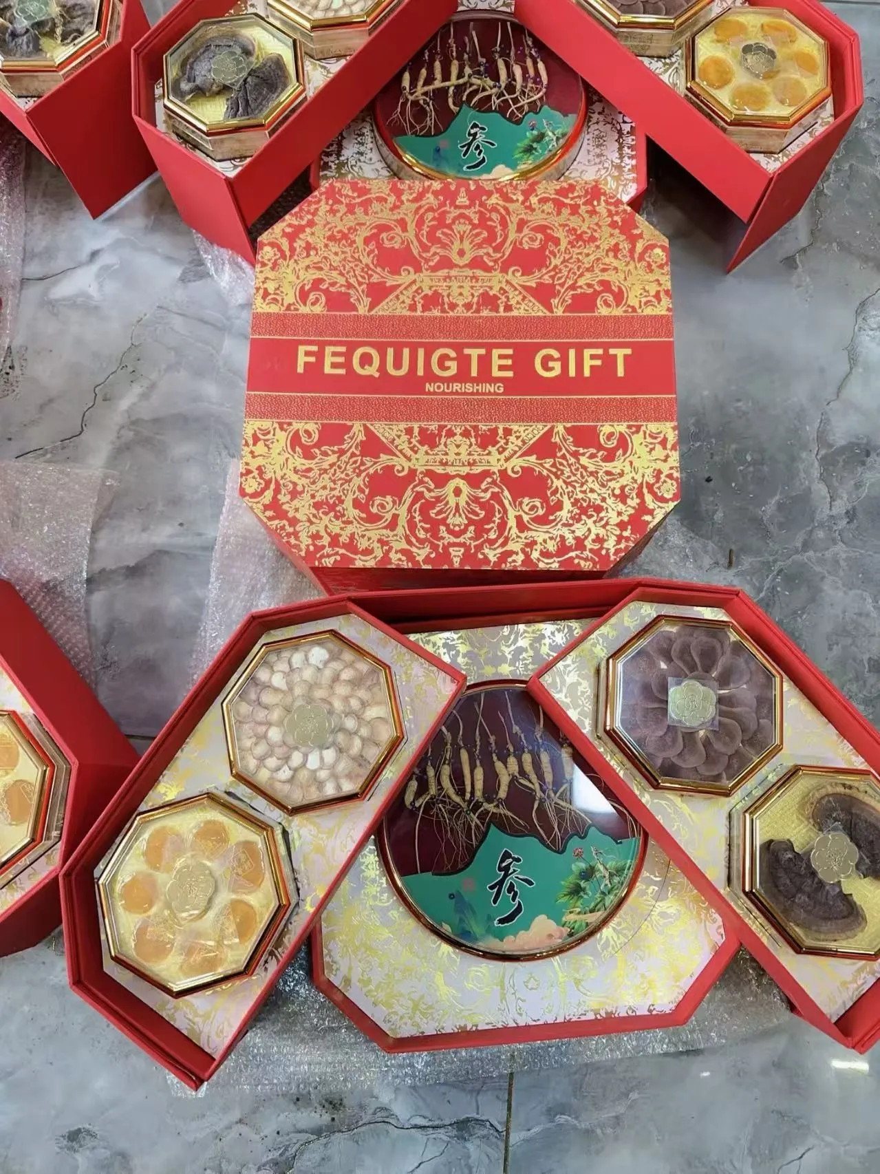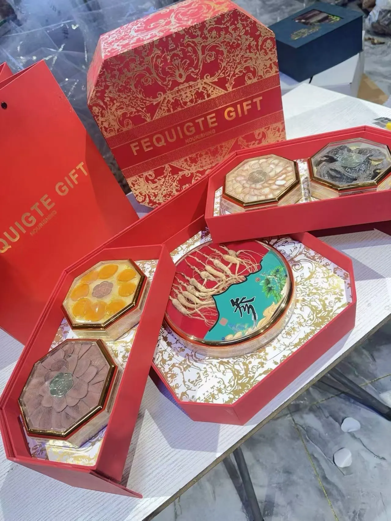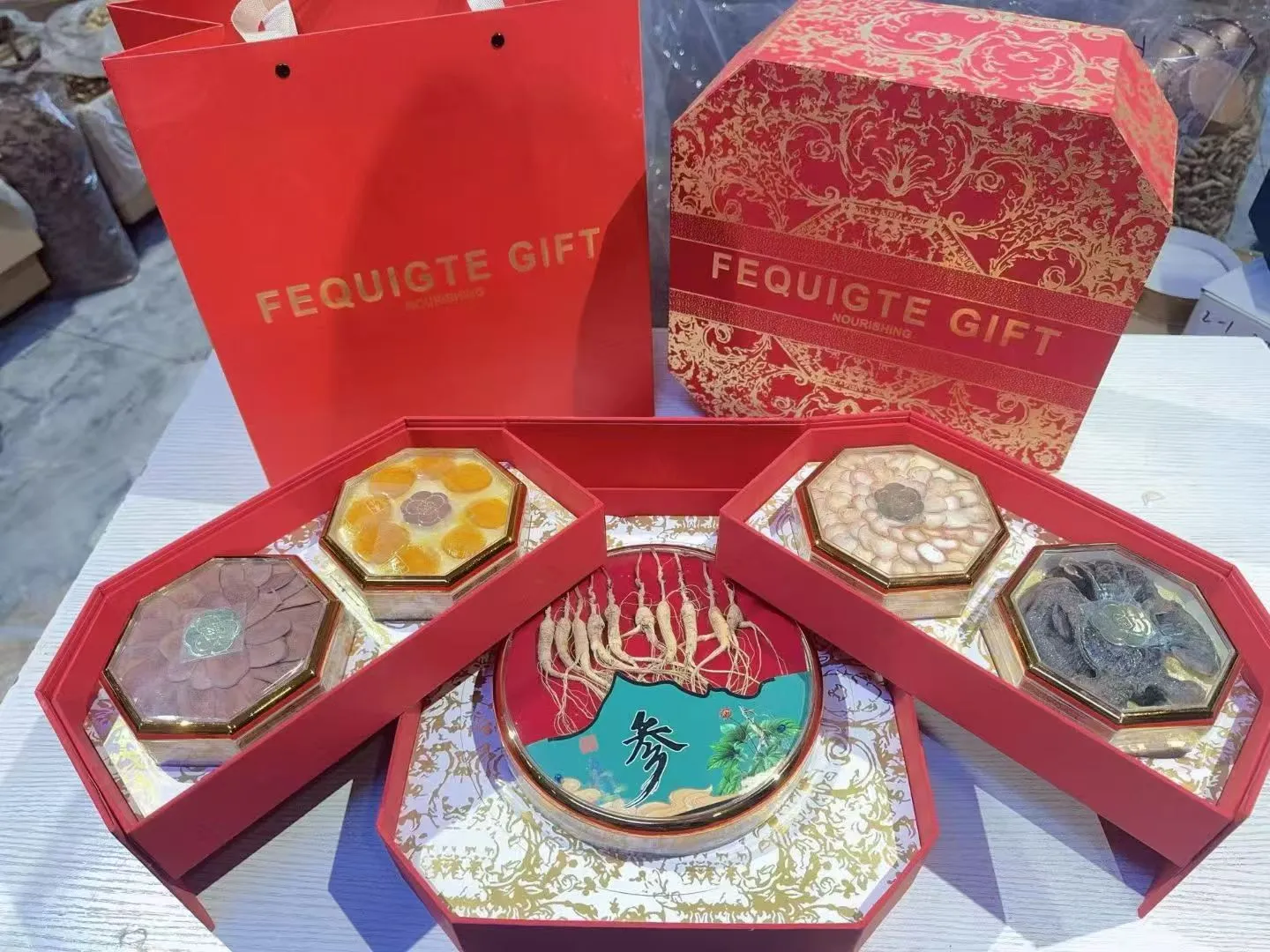 内含:林下参、鹿茸、人参蜜片、灵芝,采用双层设计,高端大气,送礼必备。