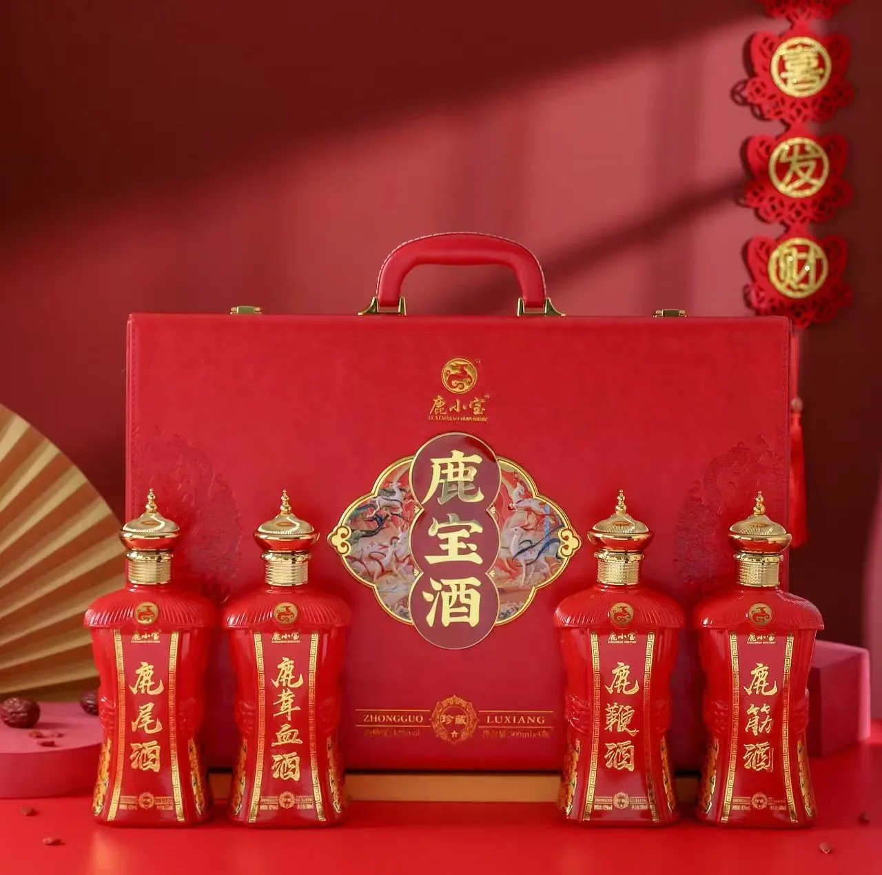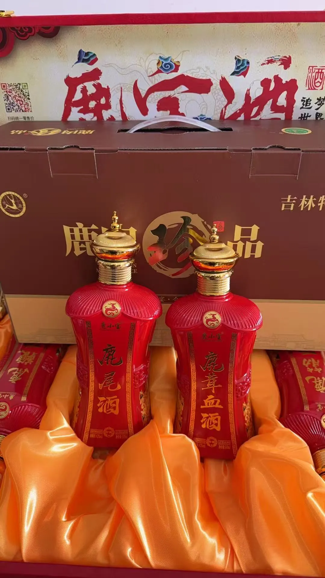 鹿宝酒礼盒送礼大方,一盒里面是四瓶酒,一瓶是500ml 四合一礼盒,鹿鞭酒 鹿茸血酒 鹿筋酒 鹿尾酒。礼盒内置二维码官方扫码价是2688,特别适合过节送礼,大气上档次。